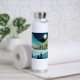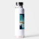 Un magnifique paysage aux textures uniques qui montre un paysage lacustre de montagne avec une lune montante et un ciel étoilé dans les tons bleu, or, vert et turquoise.