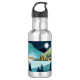 Un magnifique paysage aux textures uniques qui montre un paysage lacustre de montagne avec une lune montante et un ciel étoilé dans les tons bleu, or, vert et turquoise.