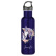 Bouteille d'eau avec une élégante aquarelle illustrant une mère aquarelle et une licorne de bébé avec crinière violette et ancre. Des fleurs d'oranger délicates entourent la paire.