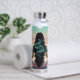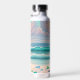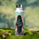 Beau art aérien représentant une femme magnifique méditant sur la plage avec porcelaine et nuages bleus, vagues de l'océan, sable blanc et verre de mer.