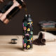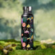 Voici une bouteille d'eau amusante qui peut vous emmener des tâches domestiques à la plage ou ailleurs dans le style! On y trouve un motif d'images tropicales, notamment des citrons et des tranches de pamplemousse, des feuilles de palmiers, des bars glacés, un oiseau toucan et, bien sûr, un flamant rose. Le motif est placé sur un arrière - plan noir dramatique.