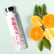 Un amusant motif de pois rouge accentue le fond de cette bouteille d'eau personnalisée avec votre nom imprimé verticalement en lettres chic des deux côtés.