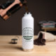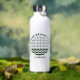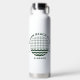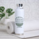 Avant : Logo vert rond sur bouteille blanche. Retour : "L'eau est la seule boisson pour une personne sage." —Thoreau