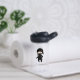 Un mignon dessin animé en ninja habillé en noir tient une étoile qui lance. On peut voir le katana d'épée japonais traditionnel attaché par-dessus son épaule.