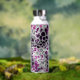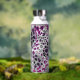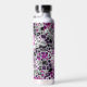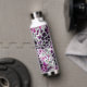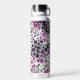 Wild Rhythm water bottle is white with pink and purple leopard spot animal print and charcoal accents.