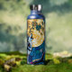 A wildlife themed water bottle. A vibrant colorful ai illustration of a mosaic style wolf, an owl and a full moon in a stained glass vibe.