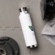 Une Bouteille isotherme avec un dessin de brimbelles ou myrtilles et ses feuilles vertes : une bonne idée pour prendre une boisson chaude ou froide au travail ou en randonnée. Le texte est personnalisable !