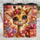 This enchanting digital illustration features an adorable baby giraffe with large, sparkling purple eyes and a sweet smile. The giraffe is adorned with a vibrant red and gold heart-shaped bowtie and is surrounded by a mountain of beautifully wrapped Valentine gift boxes in shades of pink, purple, and gold. The background is a magical, starlit scene filled with glowing golden light, shimmering stardust, and dozens of floating hearts. Lush floral accents and delicate sparkling trails add a sense of wonder and festive joy to the composition. This seamless-style graphic is designed as a full-wrap for insulated tumblers, providing a high-impact, 360-degree visual experience. The warm, rich color palette and whimsical character design make it an ideal gift for Valentine Day, birthdays, or any wildlife lover who enjoys a touch of fantasy.