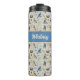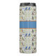 This thermal tumbler features a beautiful avian pattern of kingfishers, robins, blue jays, woodpeckers, nests with eggs, and more. Great way to stay hydrated while listening to birdsong or gift for the nature lover or birder in your life. Your or your recipient's name appears in a cream color against a color block of robin's egg blue.