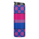 Trempeuse thermique avec le drapeau de la fierté de bisexualité et un motif de fleurs géométriques sans couture aux couleurs du drapeau de la fierté ; un design de fierté rose, violet et bleu bi sur un arrière - plan bleu avec un modèle de texte modifiable pour votre nom ou message