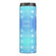 Blue travel mug with a black lid featuring a pattern of white bokeh circles, creating a calming and modern look.