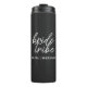 Tumbler "Bride Tribe" simple, moderne et élégant avec une police script en noir et blanc dans un style tendance. Les noms peuvent être personnalisés avec les noms de vos demoiselles d'honneur. Vous pouvez l'utiliser pour la mariée, les demoiselles d'honneur, les filles des fleurs ou la mère de la mariée. Les accessoires coordonnés pour l'équipe de la mariée conviennent parfaitement pour les propositions de demoiselles d'honneur, la douche de mariée, l'enterrement de vie de jeune fille, le dîner de répétition, la matinée du mariage ou le brunch du lendemain du mariage. En fait, un cadeau personnalisé attentionné pour l'équipe de la mariée.