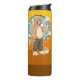 character wearing a cute, full-body pufferfish. They have wavy brown hair and a faceless aesthetic, holding a warm mug of coffee.