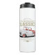 C'est un rendu d'un pick-up classique américain blanc avec des graphismes de style vintage dans l'arrière - plan pour un look rétro.
