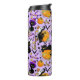 Chats noirs mignons parmi les citrouilles, bonbons d'halloween, chauves-souris, balai, étoiles, maïs bonbon, glands, pleine lune, feuilles d'automne et un fantôme coupé, le tout dans un décor violet clair