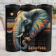 Cette image carré frappante présente un portrait stylisé de la tête d'un éléphant en profil contre un arrière - plan noir avec des rayures horizontales dans les tons orange et jaune. L'éléphant est rendu dans les tons cool de gris et de bleu, avec des sections de son oreille apparemment éclairées par des motifs chauds à fleurs orange et jaune. Une petite fleur de lotus aux contours éclatants repose près de son tronc, et un coeur orange délicat flotte au-dessus de sa tête, créant un effet surréaliste et enchanteur. : REMARQUE remplacez le nom par votre nom