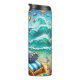 Cette illustration fantaisiste représente un éléphant heureux en vacances sur une plage tropicale. Il se détend sur un transat à rayures, porte un casquette en paille et des lunettes de soleil, et savoure une boisson colorée. La scène animée comprend un parasol, des vagues de l'océan qui s'écrasent et des coquillages épars, créant une oeuvre d'art joyeuse et amusante sur le thème de l'été.