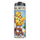 Cette drôle d'illustration présente un bébé poussin enchevêtré dans les lumières de Noël, qui a l'air exaspéré. Deux autres poussins regardent avec indifférence. Un signe humoristique de l'arrière - plan dit : "PAS MON ARBRE, PAS MON PROBLÈME", saisissant avec une touche de sarcasme le côté chaotique et relatif de la décoration des vacances.