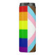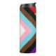 La variante "Progress" du drapeau arc-en-ciel ajoute un chevron le long de l'arbre qui présente des rayures noires, marron, bleu clair, roses et blanches pour amener ces communautés (les personnes marginalisées de couleur, les personnes trans, les personnes vivant avec le VIH/SIDA et celles qui ont été perdues) au premier plan ; "la flèche pointe à droite pour montrer le mouvement, tout en étant le long du bord gauche, montre que des progrès restent à faire."