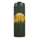 Ce design esthétique dépeint une scène dans les bois de nuit dans des couleurs dorées impressionnantes avec une silhouette arborée et forestière et un croissant de lune.