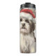 Ce design festif reflète l'esprit joyeux de la période des fêtes, avec un adorable petit portant un chapeau de Père Noël. Le chien est niché dans un pays des merveilles hivernales, avec un bonhomme de neige, un sapin de Noël décoré et des cadeaux joliment emballés. Les flocons de neige tombent doucement, ajoutant une touche magique à la scène, tandis que les couleurs vives des décorations de vacances créent une atmosphère chaleureuse et joyeuse.