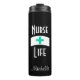 Conception sympa pour les infirmières et fait une excellente idée cadeau pour toute occasion. arrière - plan noir personnalisable avec le blanc et turquoise de l'infirmière turquoise casquette et la croix médicale devant le tumbler. "Nurse Life" est en typographie blanche.