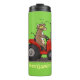 Cette drôle de vache brune conduit un tracteur rouge. Beaucoup de plaisir pour les fermiers ou les amateurs de vache!