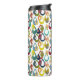 Cette bouteille thermale a un design moderne du milieu du siècle de gouttes de pluie avec des trous dans des couleurs rétro répétées à travers le design sur un champ de blanc.