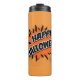 Happy Halloween illustration de style comique avec design de texte, chauve-souris et décorations d'étoiles sur arrière - plan de demi-ton. Il est possible de changer la couleur arrière - plan et d'en ajouter une autre dans le design avec votre choix.