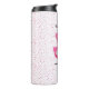 This thermal tumbler bottle to keep your drinks cold or hot has two fancy mid century style cats, one white and one black, sitting together in a pink chair on a white background with pink polka dots. Customise your text with the template.