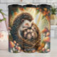 Cette illustration pleine de chaleur représente un grand hérisson qui embrasse doucement un groupe d'adorables petits hérisses dans un nid douillet fait de brindilles. La scène se déroule dans une forêt capricieuse avec des rayons lumineux, des feuilles d'automne colorées et de charmants champignons, créant un moment familial tendre et aimant dans la nature.