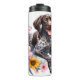 Un joyeux pointeur germanique aux cheveux courts, à la bouche ouverte et à la queue agitée est posé de façon ludique au milieu d'un florilège de tournesols et de pivoines roses, avec des touches de bleu et d'autres fleurs sauvages colorés. Les oeuvres d'art reflètent l'esprit dynamique et heureux de la race dans un cadre fleuri et animé.