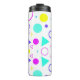 Bring retro vibes on the go with this 80s Memphis geometric pattern travel mug. Its vibrant shapes and bold colors add a playful touch to your daily coffee or tea routine. Perfect for commuters and design lovers.