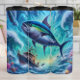 Un thon colossal explose des vagues turbulentes de l'océan, éclipsant un bateau de pêche qui affronte une tempête dramatique avec la foudre. Les poissons plus petits se dispersent alors que le thon géant domine la scène, mettant en valeur la puissance brute et la majesté de la mer et l'excitation de la pêche en haute mer.