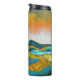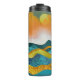 paysage Abstrait d'une vue de montagne avec des collines ondoyantes et une tempête de pluie en orange, or, bleu et cyan.