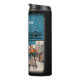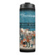 Cette bouteille thermo-tondeuse pour garder vos boissons froides ou chaudes a un groupe de préformeurs de rue, y compris des musiciens et des chanteurs dans la neige par une lampe de rue. Un bar de notes de musique est au-dessus d'eux dans le ciel bleu de la nuit, l'image s'estompe en noir autour de la bouteille. Customisez votre nom avec le modèle.