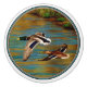 Les canards colverts mâles et femelles volent au-dessus d'un étang doré, l'eau ondulant pour refléter les couleurs du feuillage d'automne arrière - plan qui brille au soleil. OEuvre d'art réaliste créée à partir d'une peinture à l'huile originale de l'artiste faunique Crista S. Forest.