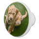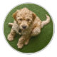 Chiot pelucheux adorable se reposant sur une pelouse, photographie prise d'en haut.