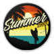 Design de style rétro avec texte "Vies d'été" avec coucher de soleil tropical et silhouette féminine surfer
