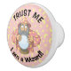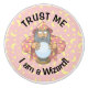 Vieux sorcier avec cape rose regardant la boule de cristal magique.