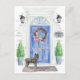 Announce your new address with our stylish announcement featuring a Bouvier des Flandres, blue front door, welcome mat, slate sign, topiaries and a floral wreath set on a grey brick background.