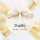 A beige, cream coloured background. Decorated with a large bow. Personalize and add the bride's name. Black handwritten style script.