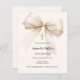 A soft beige, cream coloured background, decorated with a large bow and a golden cross. Personalize and add a name and details details.