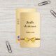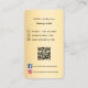 A faux gold looking background. Decorated with a golden bow. Personalize and add your name, title and contact information. Add your website url/link to the Qr code. With Facebook and Instagram icons. Black text.
