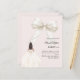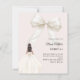 This sophisticated design features a large ivory bow adorned with delicate pearl details, paired with a graceful gown illustration. A soft blush pink colored background creates a modern, refined look that feels both luxurious and unforgettable.