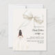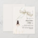 This sophisticated design features a large ivory bow adorned with delicate pearl details, paired with a graceful gown illustration. A soft ivory colored background creates a modern, refined look that feels both luxurious and unforgettable.