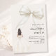 This sophisticated design features a large ivory bow adorned with delicate pearl details, paired with a graceful gown illustration. A soft ivory colored background creates a modern, refined look that feels both luxurious and unforgettable.