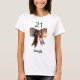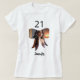A white, light coloured t-shirt Decorated with a bow shaped photo frame. Personalize and add a name and age. Black handwritten style script.