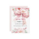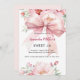 An elegant white background, decorated with a large pink bow and pink flowers. Personalize and add a name and party details.
