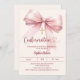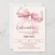 A soft cream colored background, decorated with a pink large bow and a golden cross. Personalize and add a name and details details.